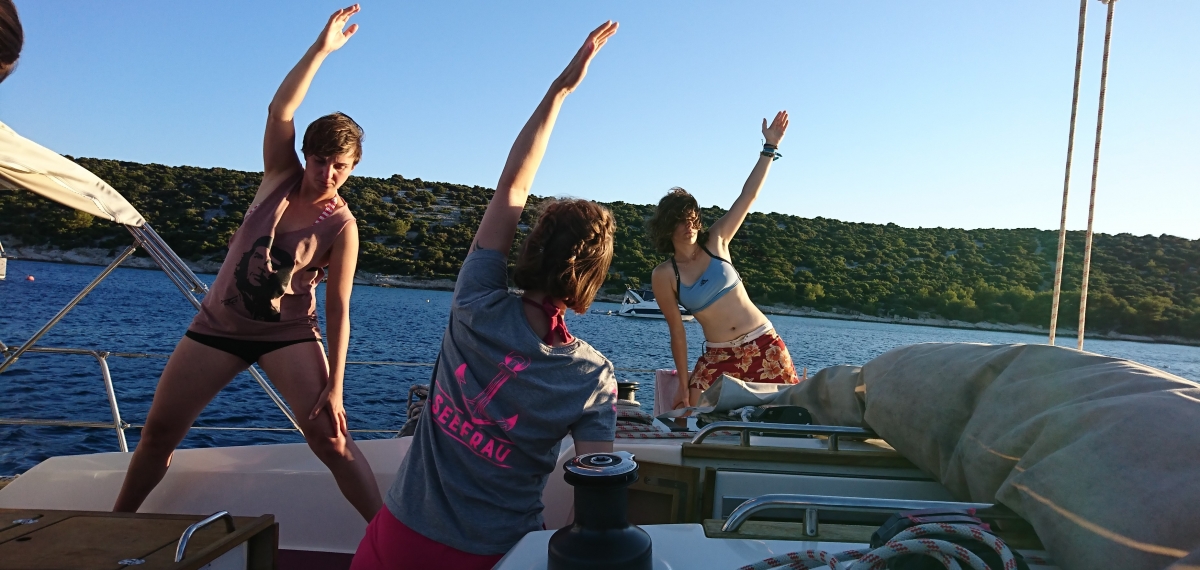 Szenenwechsel: Johanna steht am Steuer. Ihre Handgriffe wirken gekonnt. Dass sie vor drei Tagen das erste Mal ein Segelboot betreten hat, ist ihr nicht anzumerken. Sie verlagert ihr Gewicht auf den linken Fuß, steht aufrecht vorm Steuerrad und blickt konzentriert auf die kleinen Fäden im Vorsegel. Bei zwanzig Knoten Wind und Schräglage hält sie Kurs auf die Kornaten. „Ich war vorher noch nie auf einem Segelboot, und für Yoga hielt ich mich immer zu ungelenkig. Ich hatte schon Sorge, ob ich mich wohlfühle oder seekrank werde.“ Ihre Freundin Katharina hat sie auf die Idee gebracht – Segeln und Yoga für Frauen.